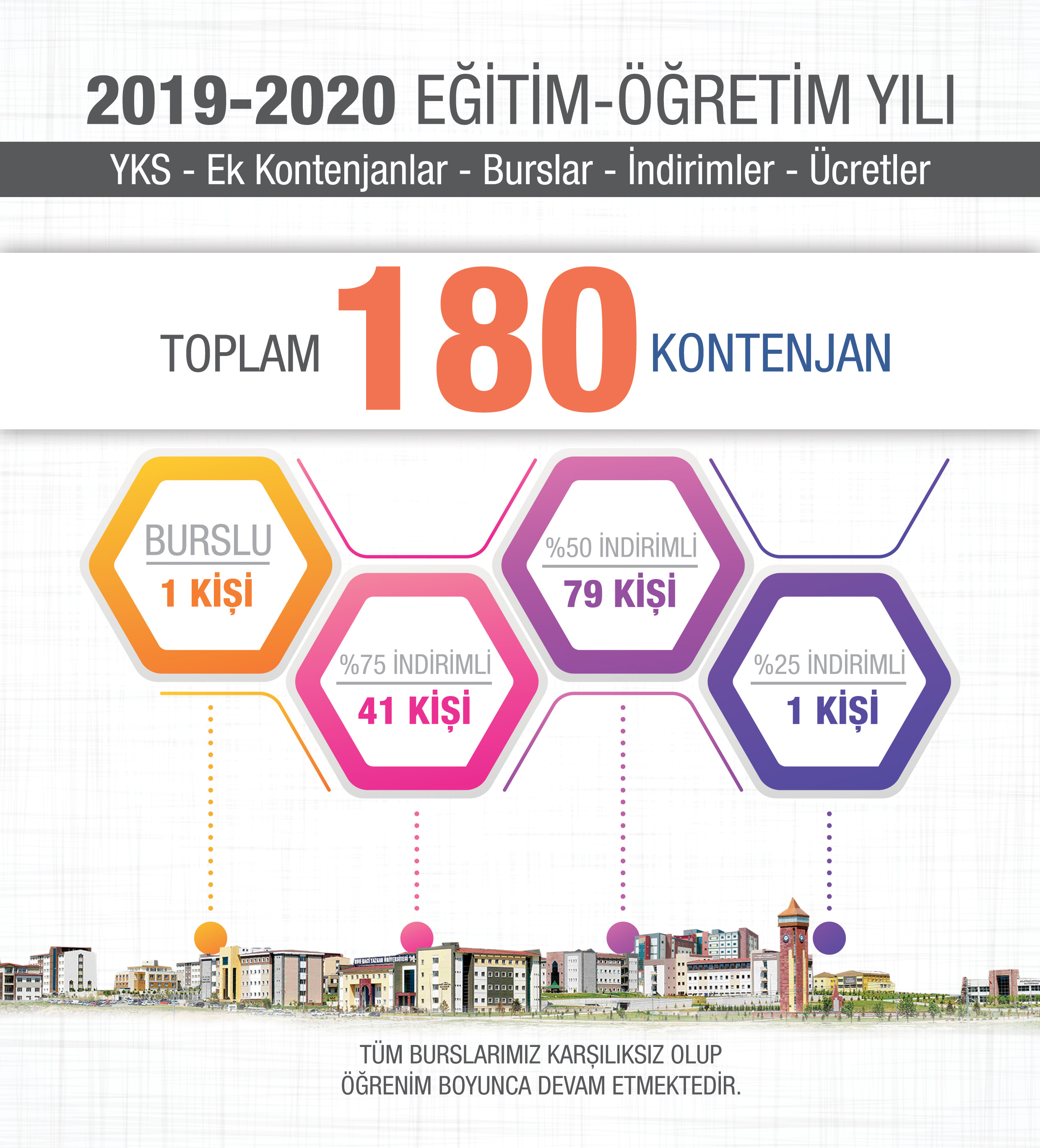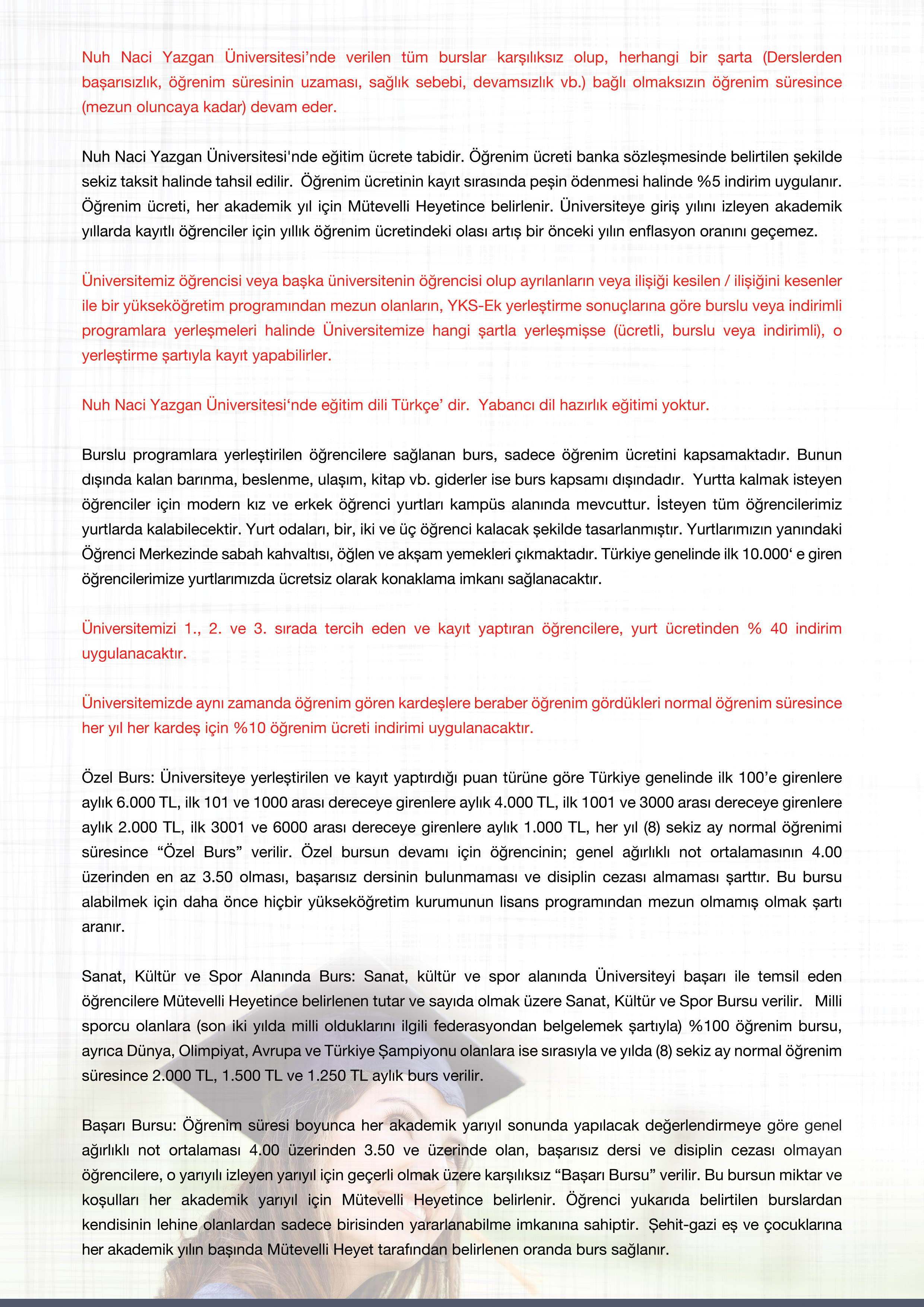 * Nuh Naci Yazgan Üniversitesi’nde verilen tüm burslar karşılıksız olup, herhangi bir şarta (Derslerden başarısızlık, öğrenim süresinin uzaması, sağlık sebebi, devamsızlık vb.) bağlı olmaksızın öğrenim süresince (mezun oluncaya kadar) devam eder.