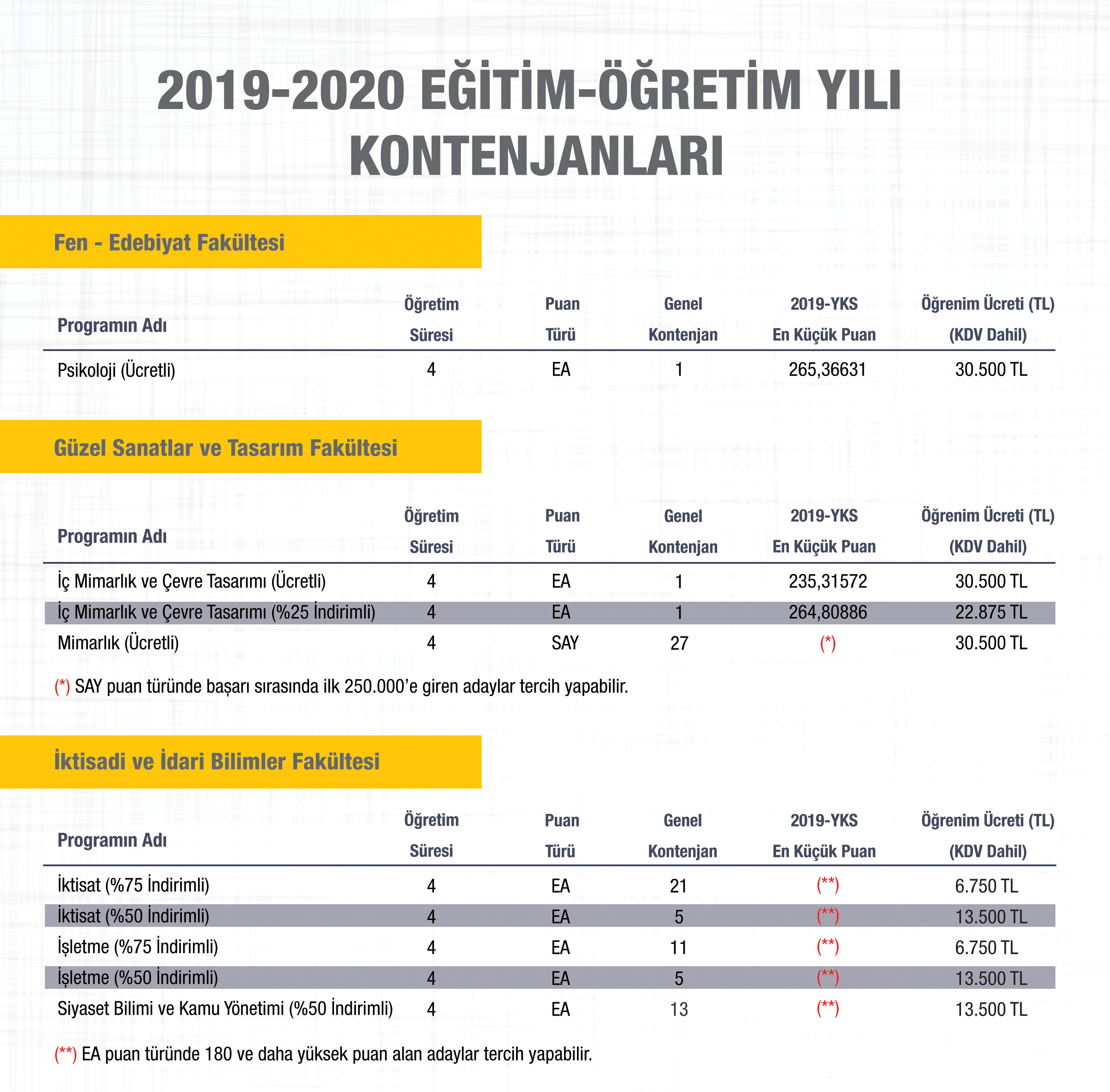 YKS-Ek Kontenjanlar, Burslar, İndirimler ve Ücretler