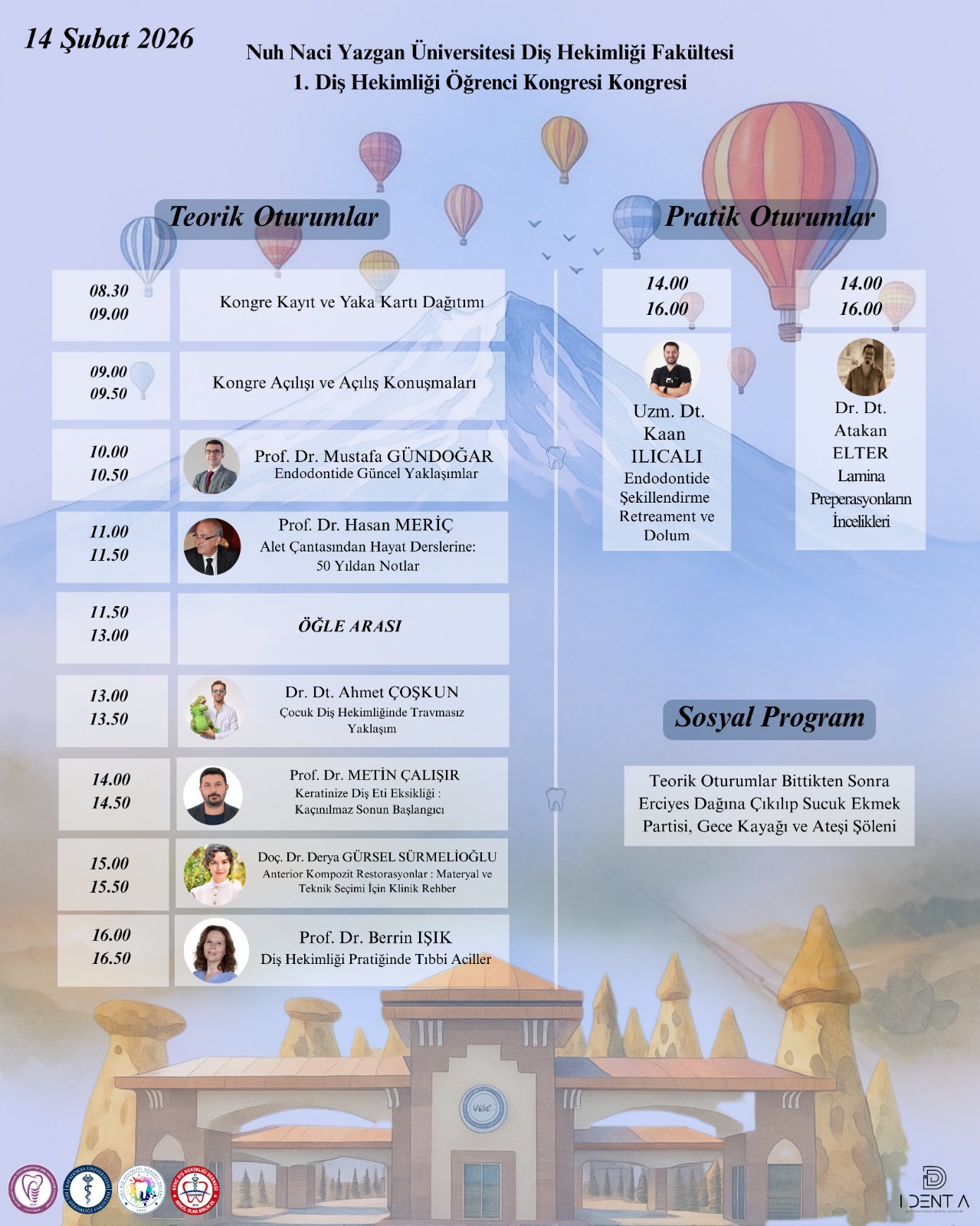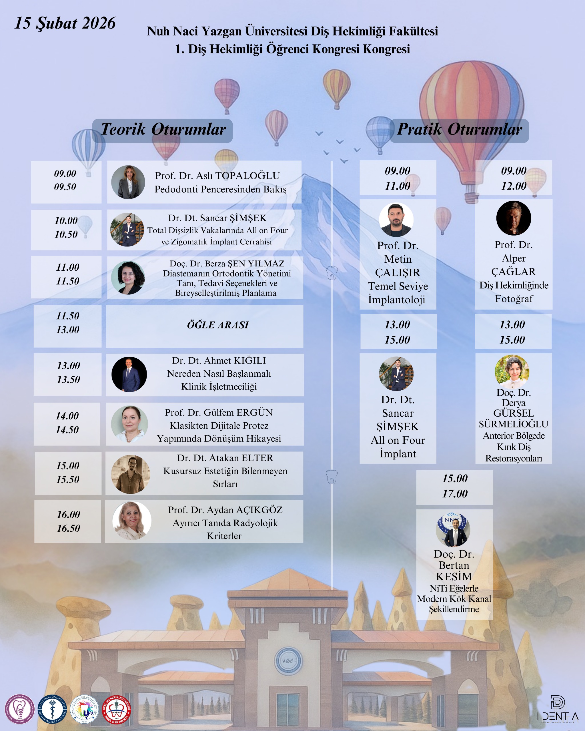 Sizleri, Nuh Naci Yazgan Üniversitesi tarafından ilk kez düzenlenecek olan 1. Diş Hekimliği Öğrenci Kongresi'ne davet etmekten büyük heyecan duyuyoruz!