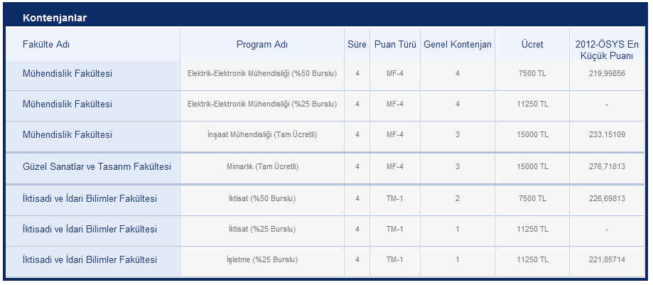 2012-2013 Eğitim-Öğretim Yılı Ek Kontenjanları, Bursları ve Ücretleri