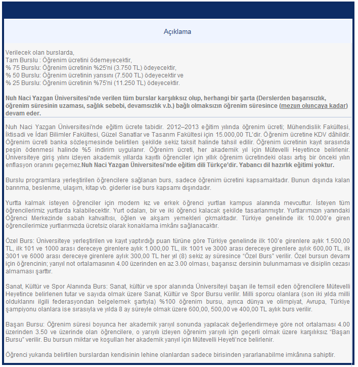 Nuh Naci Yazgan Üniversitesi'nde verilen tüm burslar karşılıksız olup, herhangi bir şarta (Derslerden başarısızlık, öğrenim süresinin uzaması, sağlık sebebi, devamsızlık v.b.) bağlı olmaksızın öğrenim süresince (mezun oluncaya kadar) devam eder.