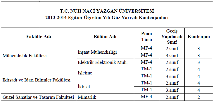 2013-2014 Eğitim-Öğretim Yılı Güz Yarıyılı Kurum İçi Yatay Geçişler