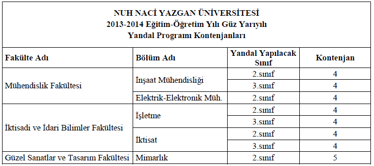 2013-2014 Eğitim-Öğretim Yılı Güz Yarıyılı Yandal Programı Kontenjanları