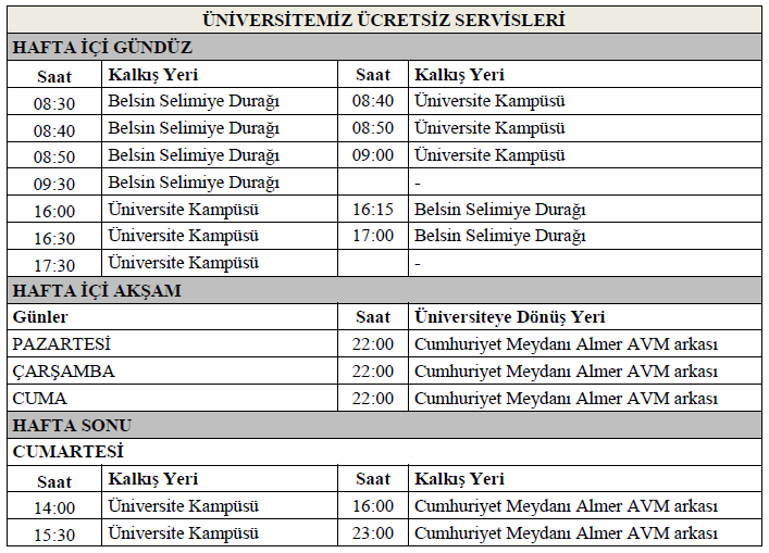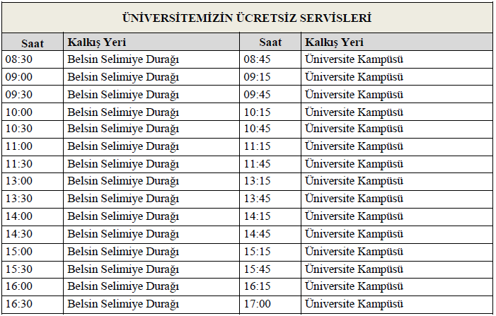 NOT: Öğrencilerimiz Şehir Merkezinden Belsin Selimiye Durağına kadar raylı sistemle gelip oradan Üniversitemiz Kampüsüne ücretsiz olarak Belediye otobüsleri veya Üniversitemiz servisi ile ulaşabileceklerdir. Benzer şekilde, öğrencilerimiz Üniversitemiz Kampüsünden ücretsiz olarak Belediye otobüsleri veya Üniversitemiz servisi ile Belsin Selimiye Durağına kadar götürülüp oradan da raylı sistemle Şehir Merkezine ulaşabileceklerdir. Böylece Şehir Merkezinden Üniversitemiz Kampüsüne, Üniversitemiz Kampüsünden de Şehir Merkezine ulaşım tek bir bilet ile mümkündür.
