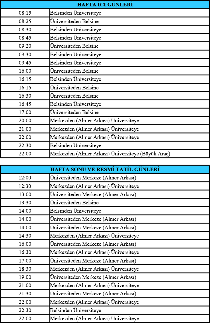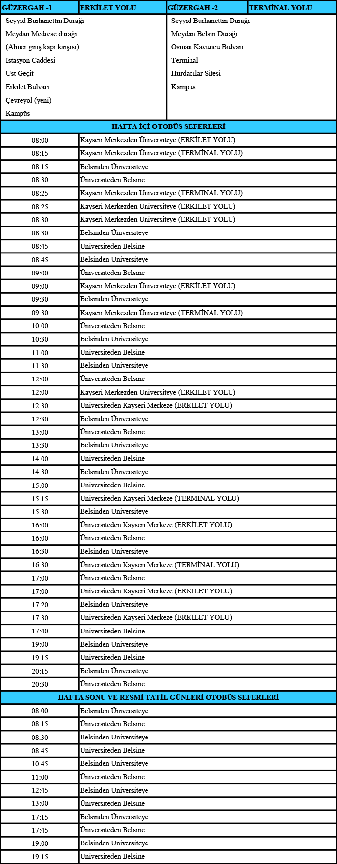 Kayseri Büyükşehir Belediyesi Başkanlığı tarafından, Şehir Merkezinden ve Belsin’den Kampüsümüze aşağıda belirtilen saatlerde servis hizmeti yapılmaktadır.