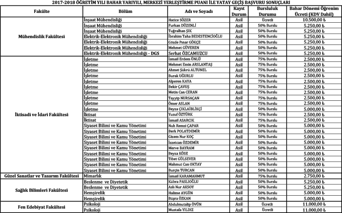 2017-2018 Öğretim Yılı Bahar Yarıyılı Merkezi Yerleştirme Puanına Göre Yatay Geçiş Başvuru Sonuçları ve Kayıt İşlemleri