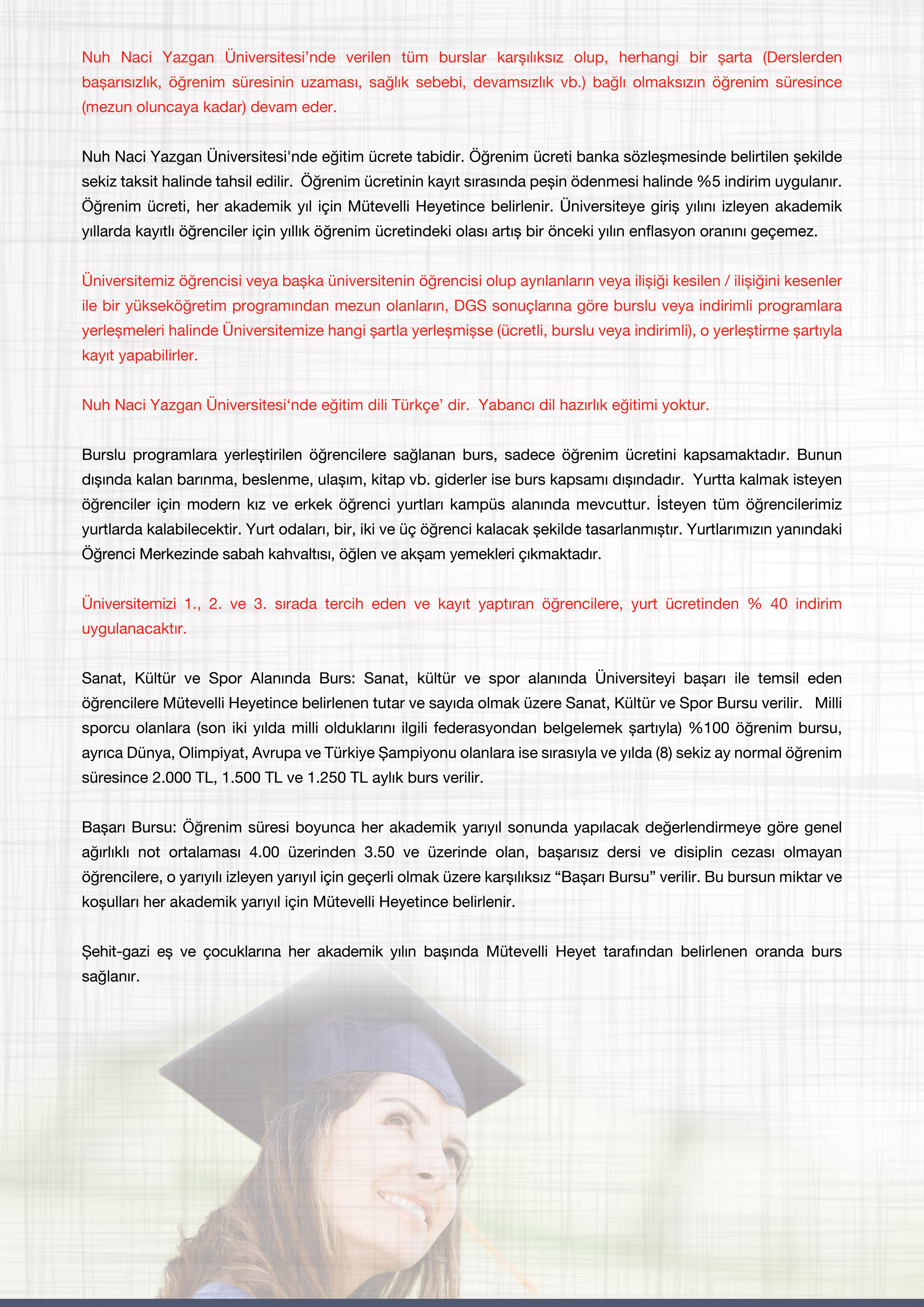 * Nuh Naci Yazgan Üniversitesi’nde verilen tüm burslar karşılıksız olup, herhangi bir şarta (Derslerden başarısızlık, öğrenim süresinin uzaması, sağlık sebebi, devamsızlık vb.) bağlı olmaksızın öğrenim süresince (mezun oluncaya kadar) devam eder.