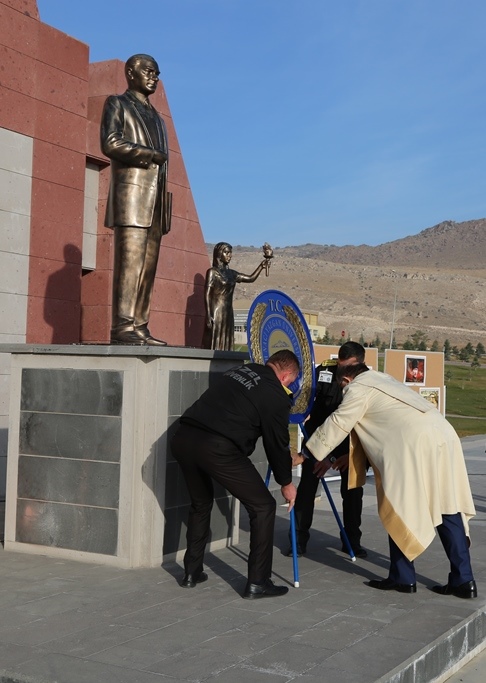 Gazi Mustafa Kemal Atatürk'ü Anma programı Üniversitemiz Kampüsü tören alanında Atatürk Anıtına çelenk sunumu ile başladı. Rektörümüz Prof. Dr. Kerim Güney, akademik ve idari personel ile öğrencilerin katıldığı törende Atatürk Anıtı'na çelenk koydu. Saatler 09.05'i gösterdiğinde 2 dakikalık saygı duruşunda bulunuldu. İstiklal Marşı’nın okunmasıyla birlikte göndere çekilen Türk Bayrağı daha sonra yarıya indirildi.