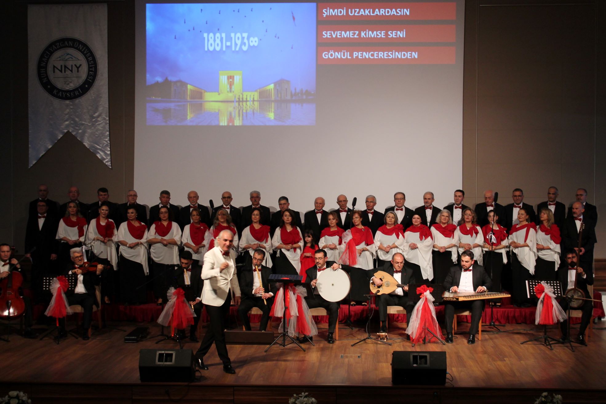 Atatürk’ün Heyeti-i Temsiliye Reisi olarak Kayseri’ye gelişinin yıldönümünde NNYÜ’de düzenlenen ikinci etkinlikte Talas Belediyesi Musiki Cemiyeti Türk Müziği İcra Heyeti, “Kurtuluş Yolu” adı altında bir konser verdi. Şef Ahmet YÜKSEL idaresindeki konserde Atatürk’ün sevdiği şarkılar ve türküler ile birbirinden güzel eserler seslendirildi. Üniversitemiz Mütevelli Heyet Onursal Başkanı Mustafa Nevzat ÖZHAMURKAR ve katılımcılar zaman zaman koroya eşlik ederek tempo tuttu. Rektörümüz Prof. Dr. Ahmet Fazıl ÖZSOYLU, İl Kültür ve Turizm Müdürü Doç. Dr. Şükrü DURSUN ile İİBF Dekanı Prof. Dr. Ali KAYA konser sonunda şef Ahmet YÜKSEL’e çiçek takdim etti.