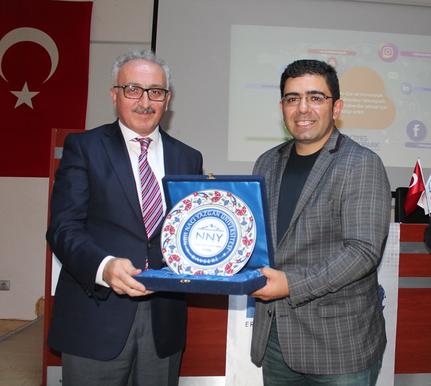 Program sonunda Üniversitemiz İktisadi ve İdari Bilimler Fakültesi İşletme Bölümü Öğretim Üyesi Doç. Dr. Onur Gözbaşı, Erciyes Teknopark A.Ş Yönetim Kurulu Başkanı Vekili Prof. Dr. Mahmut Dogan' a plaket takdim etti.