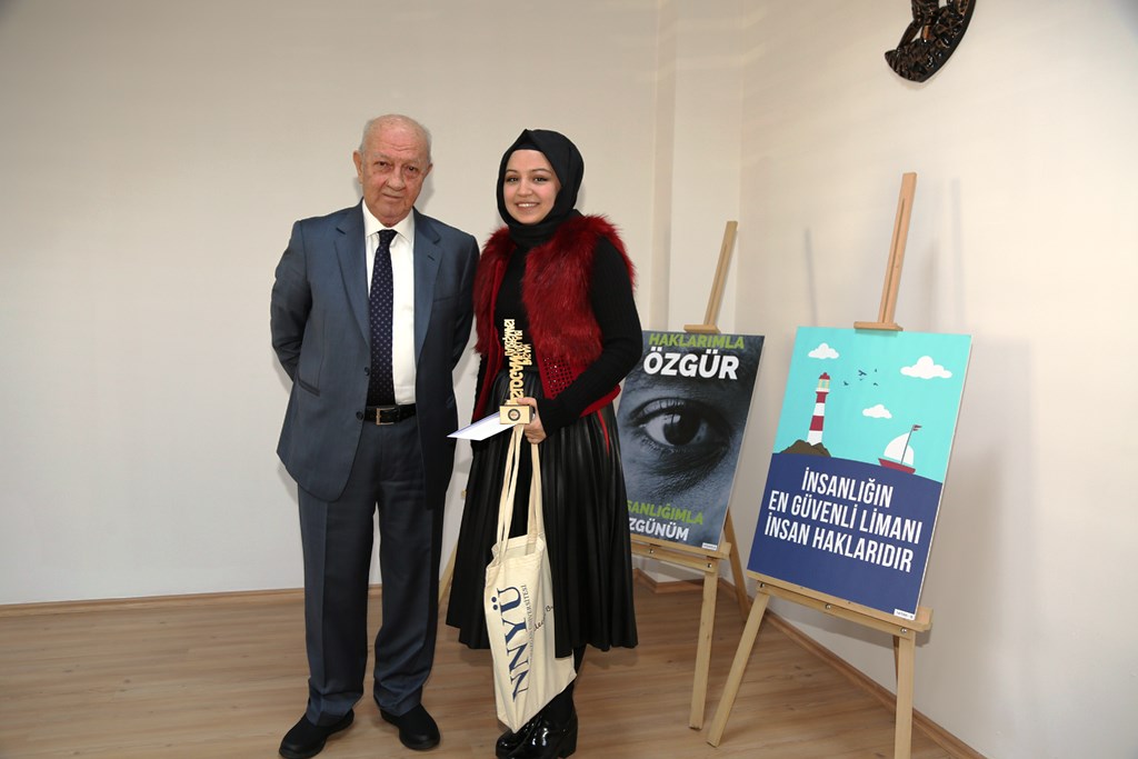 Konuşmalardan sonra Mütevelli Heyet Başkanı Sayın Mustafa Nevzat Özhamurkar ve Rektörümüz Prof. Dr. Sayın Kerim Güney, Yarışma Komisyonu Başkan ve Üyeleri Prof. Dr. Hülya Uçar, Dr. Öğr. Üyesi Yeşim Alemdar ve Dr. Öğr. Üyesi Mustafa Okur, İnsan Hakları Slogan ve Afiş Yarışmasında dereceye giren öğrencilere ödüllerini verdi.