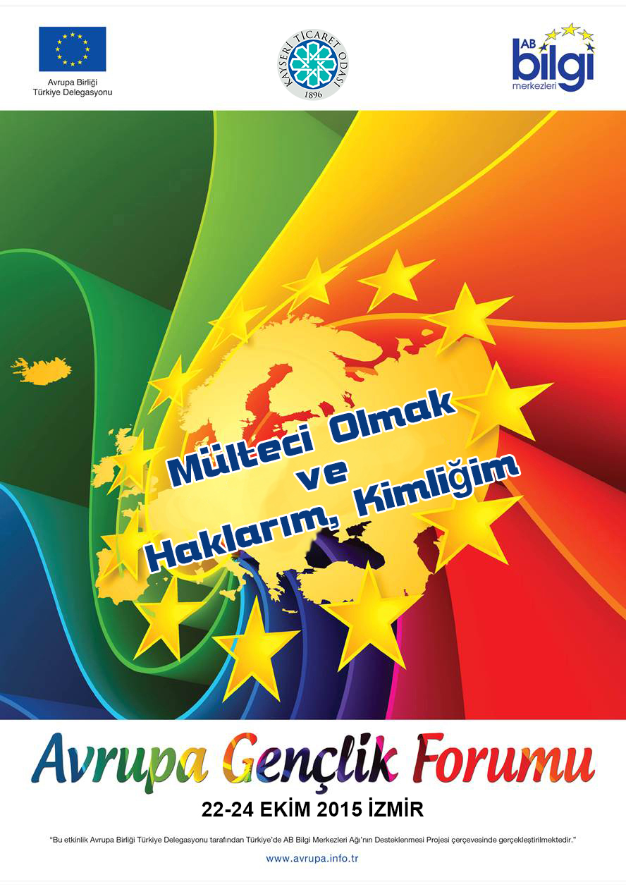Kayseri Ticaret Odası AB Bilgi Merkezi 2015 yılı etkinlikleri kapsamında, Avrupa Birliği Türkiye Delegasyonu ve AB Bilgi Merkezleri Ağı’nın bulunduğu 21 ildeki üniversite öğrencilerine yönelik “Avrupa Gençlik Forumu” İzmir ilinde gerçekleştirilecektir ve forumların teması “Mülteci Hakları ve Haklarım, Kimliğim” olarak belirlenmiştir