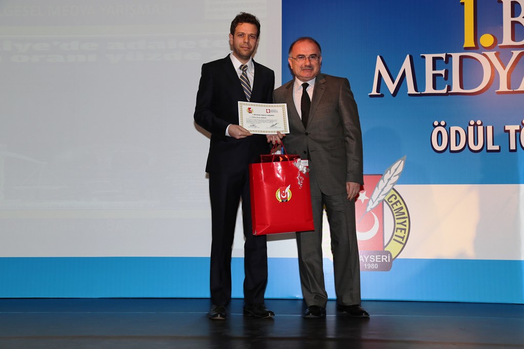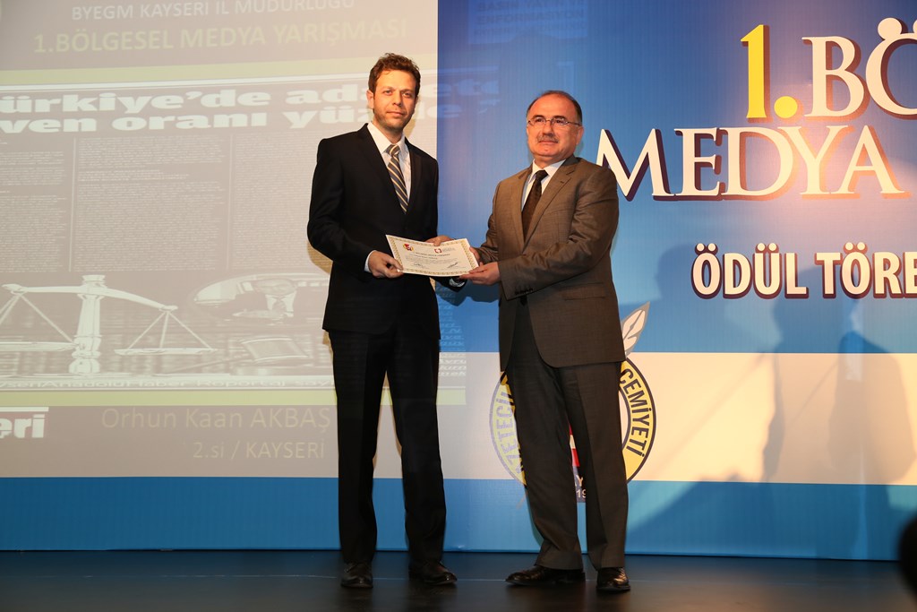 Başbakan Yardımcısı Yalçın AKDOĞAN, Enerji ve Tabii Kaynaklar Bakanı Taner YILDIZ, milletvekilleri, belediye başkanları ile Kayseri, Sivas, Yozgat, Nevşehir, Kırşehir ve Niğde illerinden gelen gazetecilerin katıldığı törende Üniversitemiz Rektörü Prof. Dr. Kerim GÜNEY, yarışmada röportaj dalında 2’nci olan Anadolu Haber Gazetesi’nden Orhun Kaan Akbaş’a ödülünü verdi.