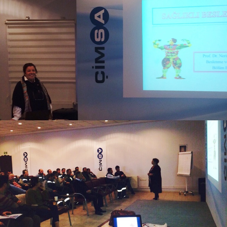 Sağlık Bilimleri Fakültesi Dekanı ve Beslenme ve Diyetetik Bölümü öğretim üyeleri tarafından ÇİMSA’da uygulamaya konulan sosyal sorumluluk projesinde, ÇİMSA personeliyle bir araya gelen Sağlık Bilimleri Fakültesi Dekanı Prof. Dr. Neriman İnanç, proje ile çalışan ve ailelerinin yaş, cinsiyet, fiziksel aktivitesi ve özel durumlarına göre gerekli olan enerji, protein, karbonhidrat, posa, yağ, vitamin ve minerallerinin besinlerle yeterince alınması için çalışanlara yönelik eğitim verileceğini ve bu eğitimlerin ilkini gerçekleştirdiklerini belirtti. Çalışanlara ilk eğitimi veren Prof. Dr. İnanç, “Bu eğitim programıyla çalışanların vücut ağırlığı, boy uzunluğu, yağ ve kas dokusu, vücut suyu miktarlarının ölçülmesi ve kan, idrar analizleri ile sorunlar saptanacak, hafif kilolu ve kilolu, diyabet ve diğer kronik hastalığı olanlara özel beslenme planları yapılarak, çalışanların; sorunlar ve çözümleri konusunda farkındalık yaratarak, davranış değişikliği yapmalarını sağlanacaktır” dedi.