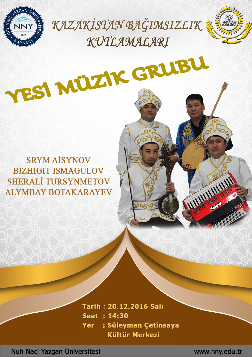 • Tarih: 20.12.2016 Saat: 14:30 Kazakistan Bağımsızlık Kutlamaları Konser: Yesi Müzik Grubu