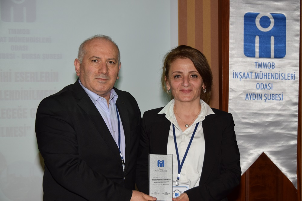 Açılış konuşmalarından sonra Üniversitemiz Güzel Sanatlar ve Tasarım Fakültesi Dekanı Prof. Dr. Ayşe Sağsöz, “Korunacak Varlıkların Niteliklerine Bağlı Olarak Koruma Bölge Kurullarında Yer Alması Gereken Disiplinler” konulu bir sunum yaptı. Konuşmasından sonra Dekan Prof. Dr. Ayşe Sağsöz’e, Bursa İnşaat Mühendisleri Odası Başkanı Mehmet Abayrak tarafından plaket takdim edildi.