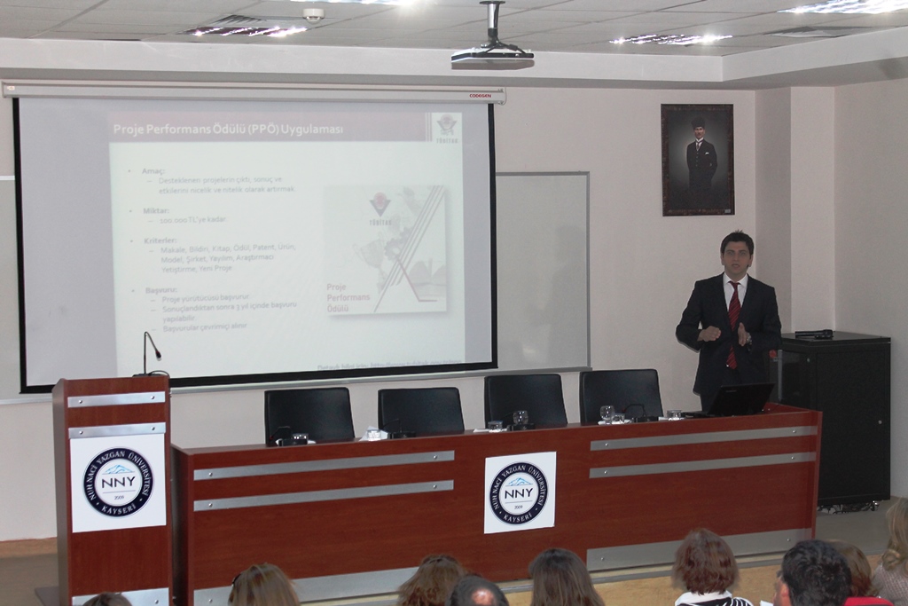 Üniversitemiz akademisyenlerine yönelik TÜBİTAK Araştırma Destek Programlarından etkin yararlanılabilmesi için yeni bilgilerin üretilmesi, bilimsel yorumların yapılması veya teknolojik problemlerin çözümlenmesi konusunda 26.05.2014 tarihinde TUBİTAK Bilimsel Programlar Uzmanı Fatih Sinan Esen tarafından eğitim verilmiştir.