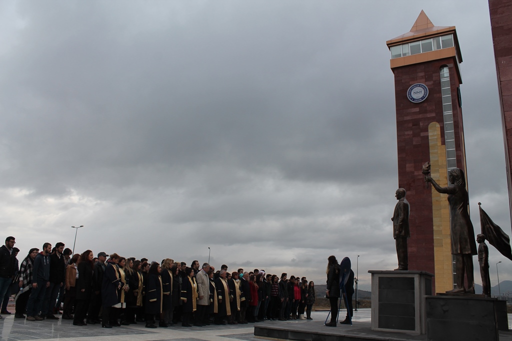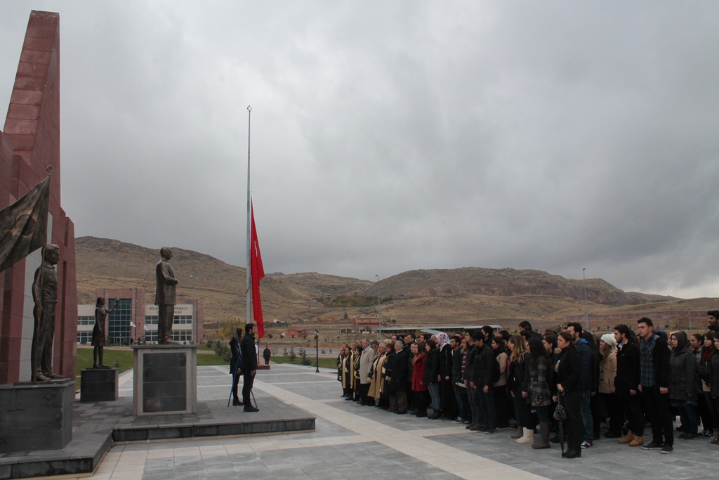 Cumhuriyetimizin kurucusu Ulu Önder Gazi Mustafa Kemal Atatürk’ü, ebediyete intikalinin 77. yıl dönümünde Üniversitemiz tören alanında düzenlenen programla andık. Akademik ve idari personel ile öğrencilerin katıldığı anma töreninde Rektör Vekili Prof. Dr. Ali Kaya, Atatürk Anıtı’na çelenk koydu. Saatler 09.05’i gösterdiğinde Atamızın aziz hatırası için Saygı Duruşunda bulunuldu ve ardından İstiklal Marşı ile birlikte göndere çekilen Türk Bayrağımız yarıya indirildi.