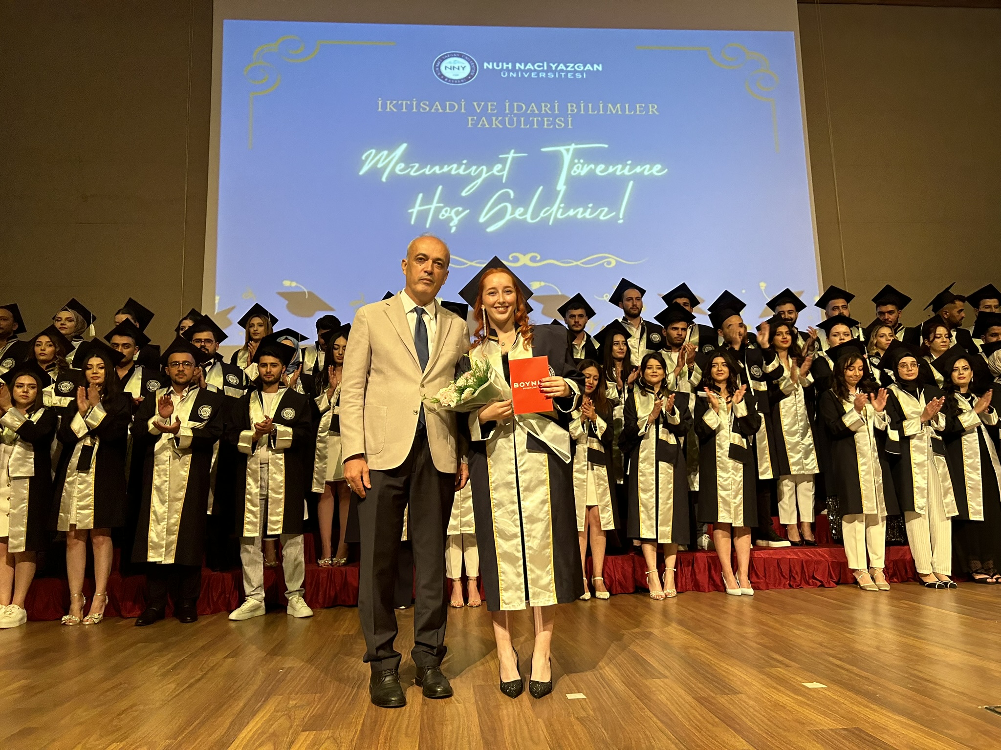 Üniversitemiz Süleyman Çetinsaya Kültür Merkez’inde düzenlenen törene Yükseköğretim Kurulu (YÖK) Üyesi Prof. Dr. Derviş KARABOĞA, Üniversitemiz Rektörü Prof. Dr. Ahmet Fazıl ÖZSOYLU, Kayseri Üniversitesi Rektörü Prof. Dr. Kurtuluş KARAMUSTAFA, Üniversitemiz Rektör Yardımcıları Prof. Dr. Neriman İNANÇ ve Prof. Dr. Erkan KÖSE, dekanlar, öğretim üyeleri, öğrenciler, aileler ve davetliler katıldı. Saygı duruşu ve İstiklal Marşı’nın okunmasıyla başlayan törende İİBF 2023-2024 Akademik yılı birincisi, Siyaset Bilimi ve Kamu Yönetimi Bölümü öğrencisi Asya Beyza ŞAHİN mezunlar adına bir konuşma yaptı. Fakülte birinciliği payesini dünya genelinde var olma mücadelesi veren kadınlara adadığını belirten ŞAHİN, “Hayatımızda önemli bir yön verecek Nuh Naci Yazgan Üniversitesi’nden çok güzel anılarla ayrılıyoruz. Nuh Naci Yazgan Üniversitesi ailesinden edindiğimiz kazanımlarla geleceğe umutla bakıyoruz.” dedi. Konuşmasından sonra Şahin’e YÖK Üyesi Prof. Dr. Derviş KARABOĞA tarafından çiçek ve hediye verildi.