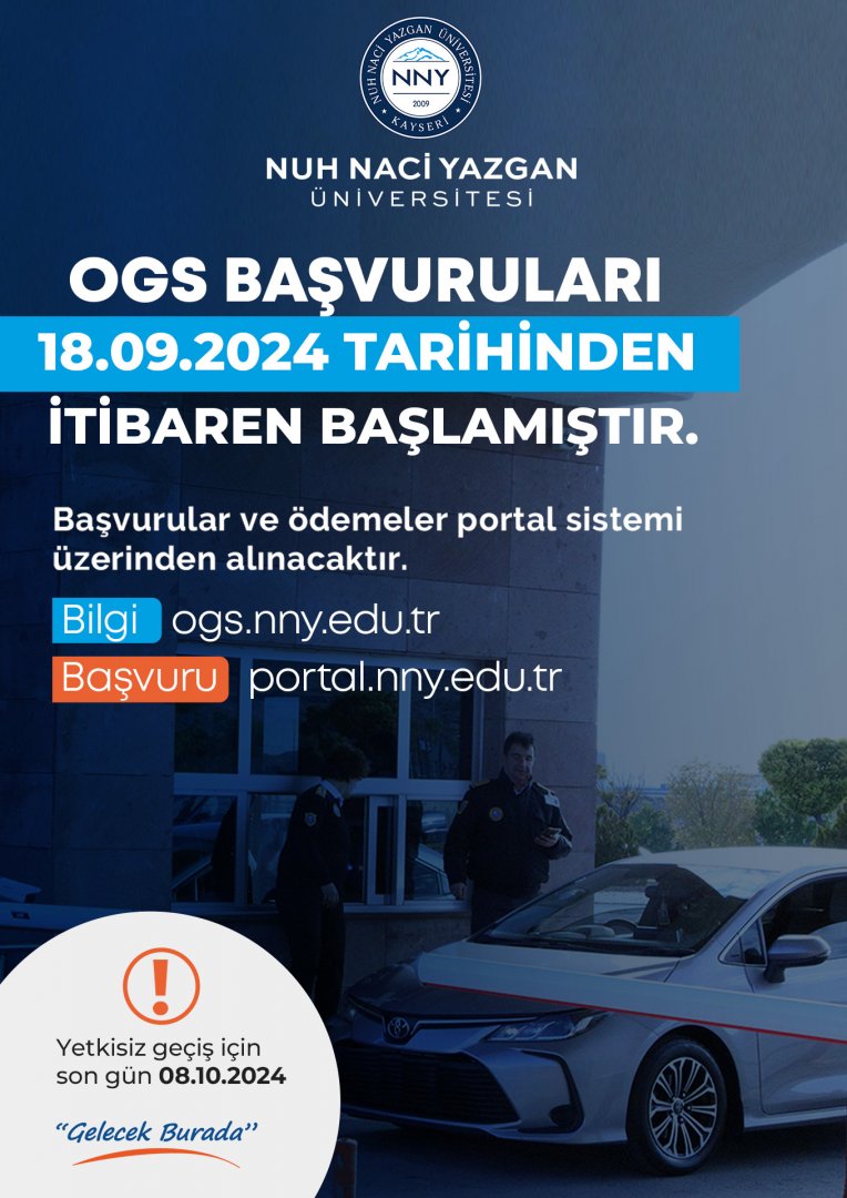Üniversitemizin portal.nny.edu.tr adresinde, 'Bilgi İşlem D. B.' menüsü altında bulunan 'OGS İşlemleri' bölümünde, yeni başvuru kısmındaki bilgilerin doldurulup istenilen belgelerin sisteme yüklenmesinden sonra, Bilgi İşlem Daire Başkanlığı tarafından belgeleriniz kontrol edilecek ve aracınız OGS için aktif hale getirilecektir