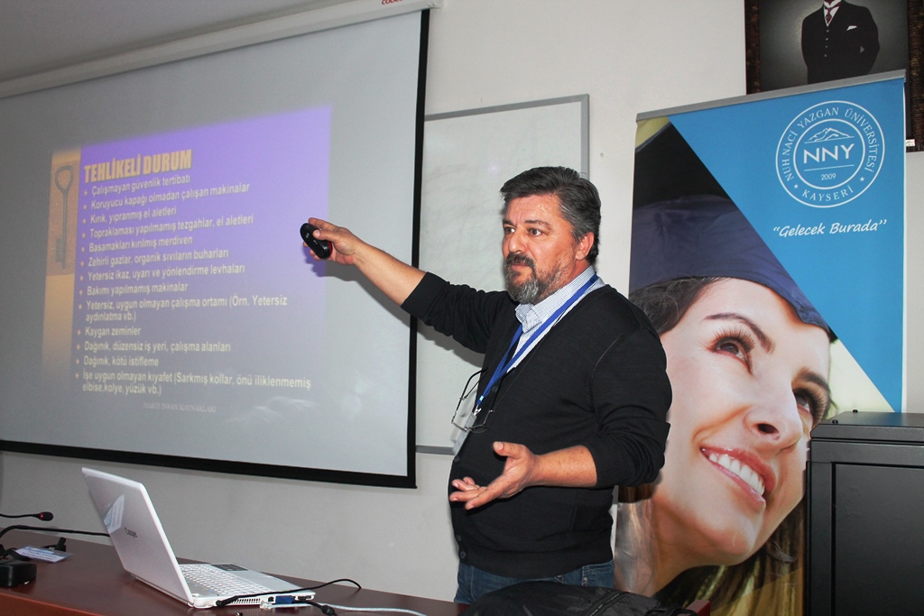 İş Güvenliği Uzmanı Celal Sümer, Mühendislik Fakültesi Konferans Salonunda düzenlenen eğitim programında yasal mevzuat ve yönetmelik, kişisel koruyucular, uyarı ikaz ve işaretleri ile iş yerlerinde tehlike ve önlemler hakkında bilgiler verdi. İş Yeri Hekimi Dr. Selim Engez ise katılımcıları iş sağlığı hizmetleri konusunda bilgilendirdi.