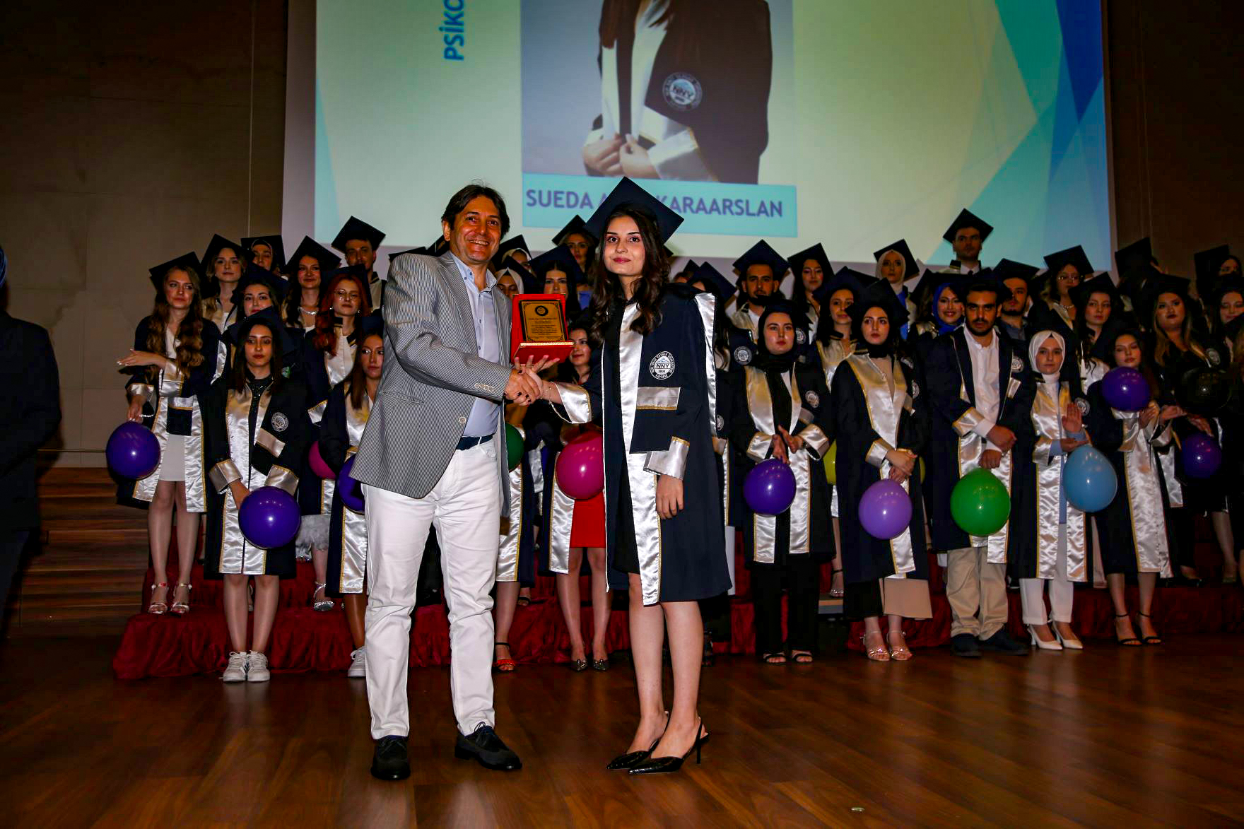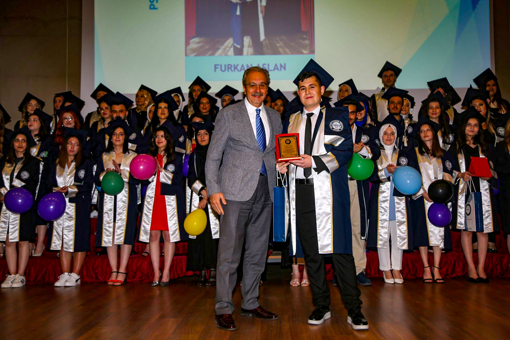 Konuşmalardan sonra dereceye giren öğrencilere plaket ve ödülleri verildi. Fakülte ve bölüm birincisi Gökçe KILINÇ, mezuniyet kütüğüne isminin yazılı olduğu plakayı çaktı. Daha sonra öğrenciler mezuniyet belgelerini bölüm öğretim üyelerinden aldı.