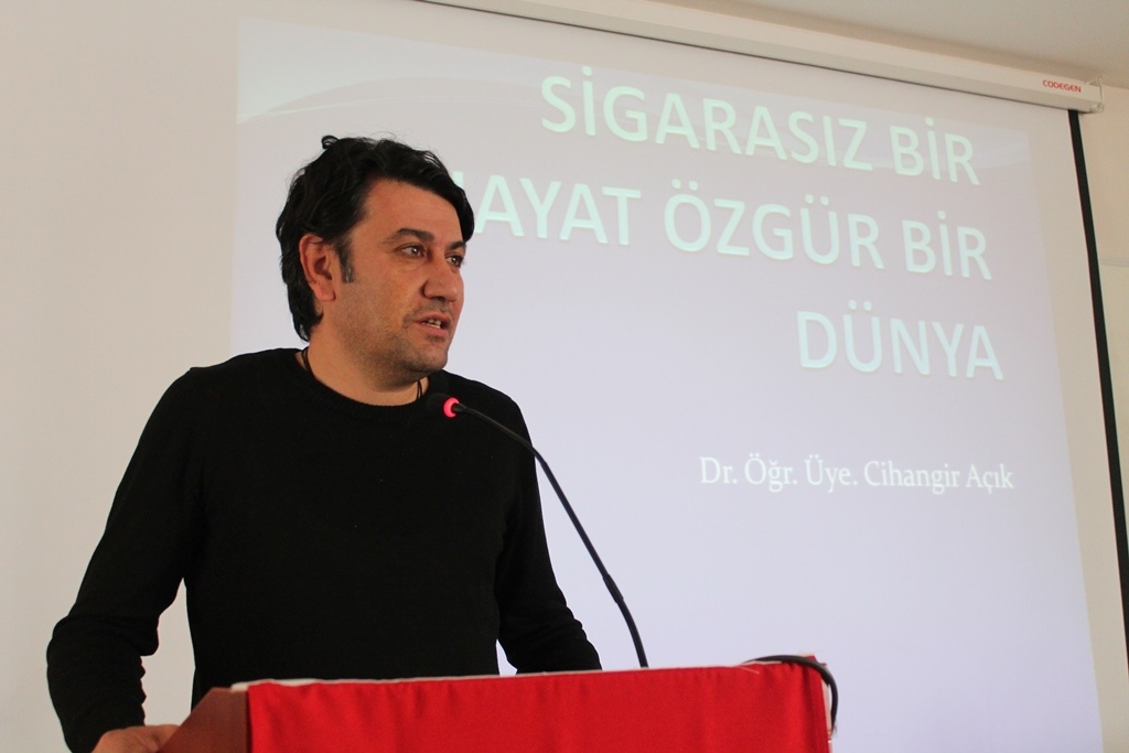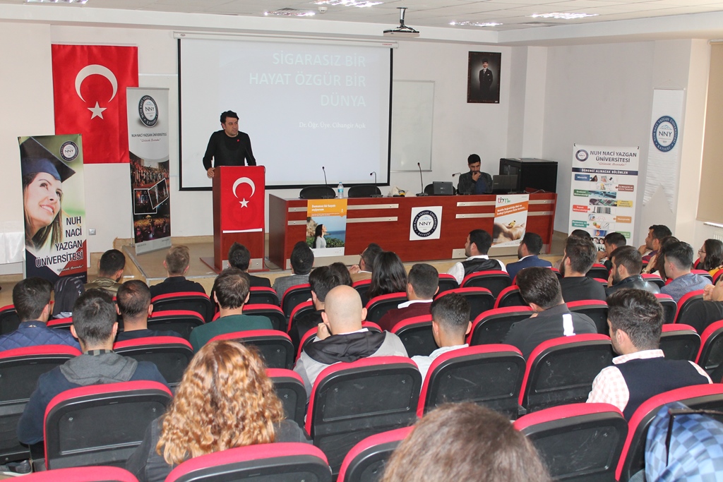 Yeşilay Kayseri Şubesi Yönetim Kurulu üyeleri ve öğrencilerin katılımıyla Mühendislik Fakültesi Konferans Salonunda gerçekleştirilen konferansta konuşan Üniversitemiz Sağlık Bilimleri Fakültesi Fizyoterapi ve Rehabilitasyon Bölümü Dr. Öğr. Üyesi Cihangir Açık, zararlı alışkanlıkların insan bedeninde yarattığı tahribatlara dikkat çekti. “Sigarasız Bir Hayat Özgür Bir Dünya” başlığı altında konuşmasına devam eden Dr. Öğr. Üyesi Cihangir Açık, “Sigara bağımlılığı günümüzde en büyük halk sağlığı sorunlarından birisidir. Tütün kullanımı dünyadaki ölümlerin tek başına en önemli nedenidir. Sigara bağımlılığı esrardan daha tehlikeli bir bağımlılık olarak karşımıza çıkmaktadır.” dedi.