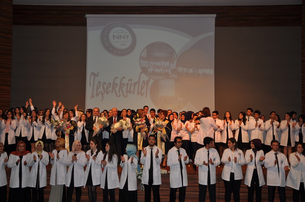 Konuşmalardan sonra sırayla kürsüye davet edilen Sağlık Bilimler Fakültesi Beslenme Diyetetik Bölümü ile Fizyoterapi ve Rehabilitasyon Bölümü birinci sınıf öğrencilerine beyaz önlükleri bölümlerinde görevli öğretim üyeleri tarafından giydirilirken, Hemşirelik ve Sağlık Hizmetleri Bölümü birinci sınıf öğrencileri de Işık Alma Töreni ile mesleklerine giden yolda teorik bilgilerini hayata geçirmek için ilk adımı attılar.