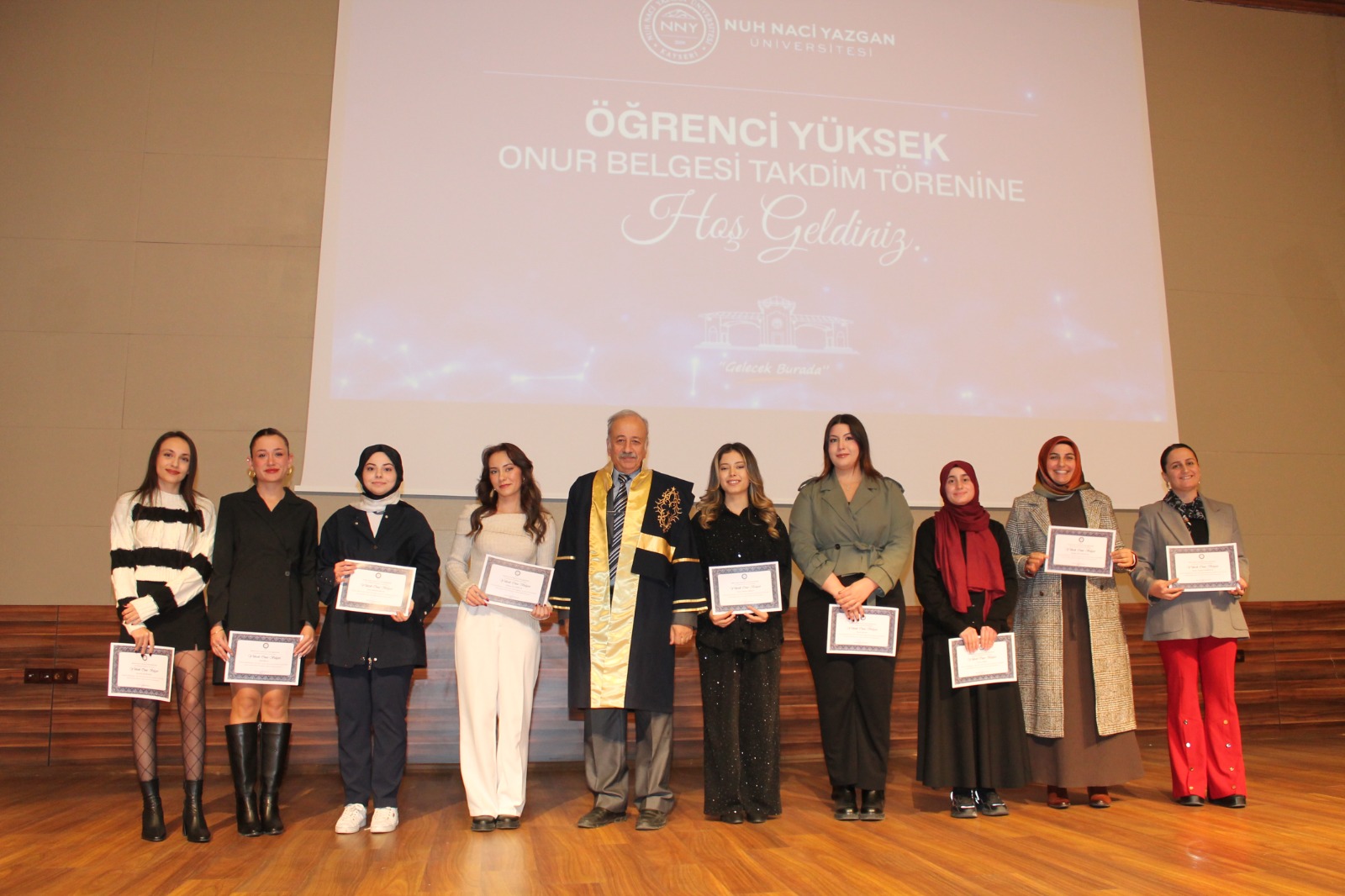 Üniversitemiz Rektörlüğü tarafından 2024-2025 Eğitim-Öğretim Yılında yüksek not ortalamasına sahip öğrencilere Yüksek Onur Belgesi Takdim Töreni düzenlendi.