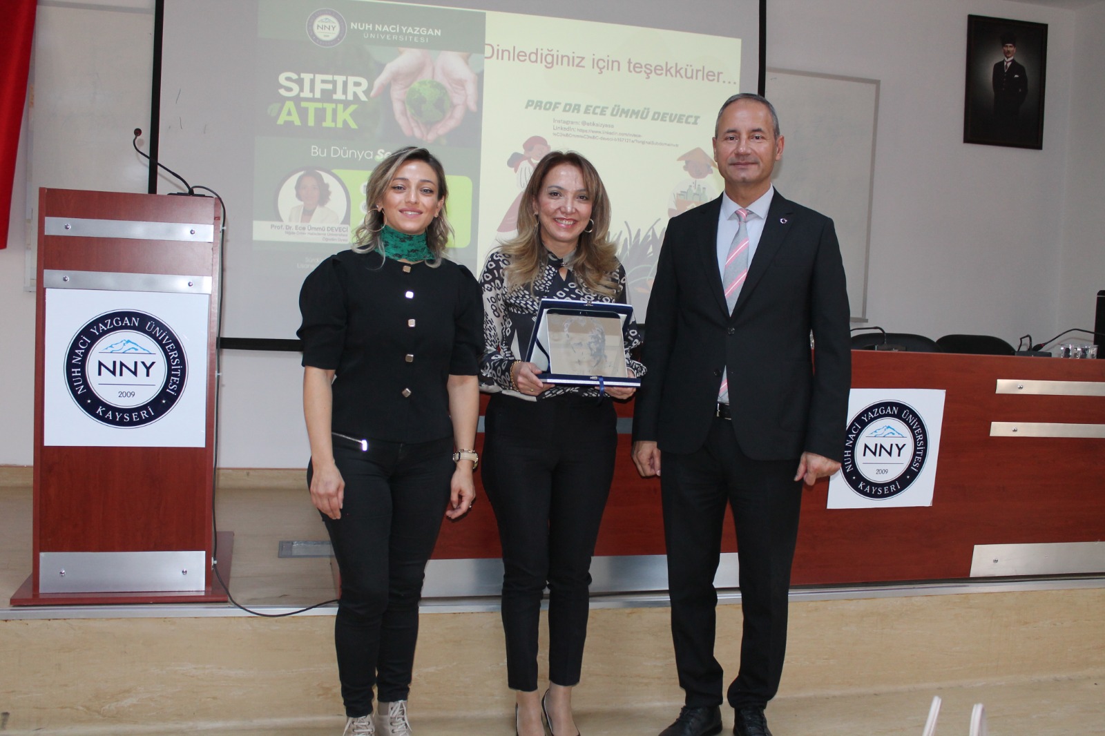 Üniversitemiz Sürdürülebilirlik Ofisi, Sürdürülebilirlik Kulübü ile Lisansüstü Eğitim Enstitüsü iş birliği ile Sıfır Atık konulu bir program düzenlendi. Niğde Halis Demir Üniversitesi Öğretim Üyesi Prof. Dr. Ece Ümmü DEVECİ Mühendislik Fakültesi Konferans Salonunda düzenlenen etkinliğe konuşmacı olarak katıldı. Üniversitemiz Rektör Yardımcısı Erkan KÖSE, dekanlar, akademik ve idari personelin yanı sıra öğrencilerin takip ettiği etkinlikte konuşan DEVECİ, sürdürülebilir sıfır atık yönetimi konusunda önemli bilgiler paylaştı. Konuşma sonunda DEVECİ’ye Rektör Yardımcımız Prof. Dr. Erkan KÖSE ve Lisansüstü Eğitim Enstitüsü Müdür Vekili Doç. Dr. Burcu ORALHAN tarafından plaket takdim edildi.