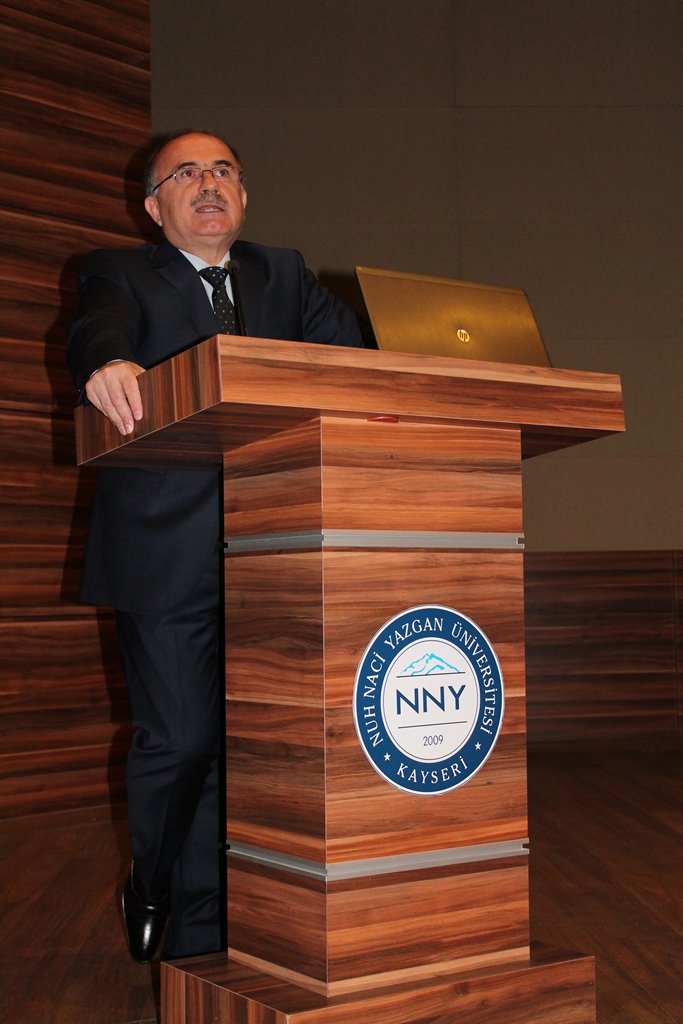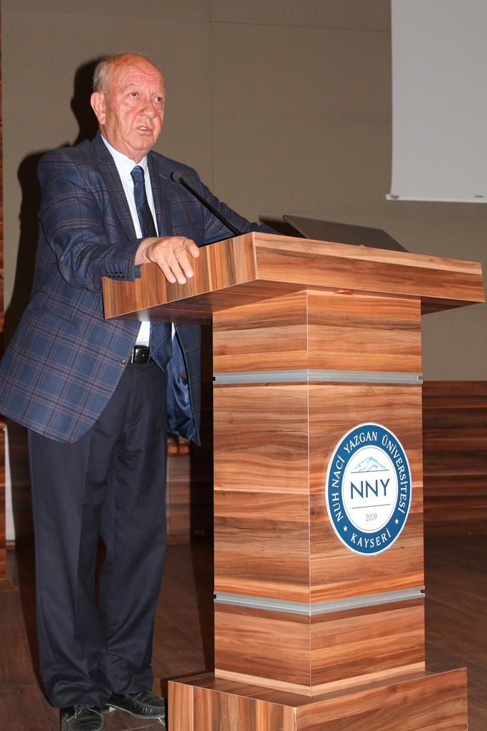 Üniversitemiz Mütevelli Heyet Başkanı Mustafa Nevzat Özhamurkar ise Kayseri Yükseköğrenim ve Yardım Vakfı tarafından kurulan Üniversitenin kuruluş aşamaları ile Vakıf hakkında bilgiler verirken tecrübelerini öğrencilerle paylaştı, altın değerinde tavsiyelerde bulundu. Sayın Özhamurkar, “Bir işe başlarken, ‘Bu Erciyes dağının önüne geldik 3916 metre yüksekliğindeki dağı nasıl aşacağız’ demeyeceksiniz. Ucundan başlayacaksınız, evvela Hisarcık, sonra Tekir, sonra o tepe bir bakarsınız ki Develi’ye inmişsiniz. Hiçbir işte yapacağınız yılgınlık olmamalıdır. Sabırlı ve doğru olmalısınız. Ok gibi doğru olursan hedefine ulaşırsın, yay gibi eğri olursan elde kalırsın. Niyetiniz halisane olacak. Hür olarak her şeyi ifade edebilirsiniz ama altında art niyet olmayacak. Burayı kendi evininiz ve aileniz gibi görün.” dedi.