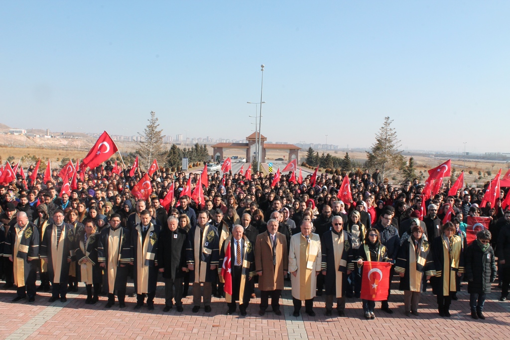 Üniversitemiz Mühendislik Fakültesi Rektörlük Binası önünde ellerinde Türk Bayraklarıyla toplanan öğrenciler, Rektörümüz Prof. Dr. Kerim Güney, akademisyen ve idari personelin katılımıyla birlikte tören alanına sloganlar atarak yürüdüler. Tören alanında toplanan kalabalık Ulu Önder Atatürk, silah arkadaşları, 15 Temmuz demokrasi şehitleri, Kayseri’de gerçekleştirilen menfur terör saldırısında şehit düşen askerlerimiz, vatanı uğruna canlarını feda eden tüm şehitlerimizin anısına saygı duruşunda bulunarak İstiklal Marşı okudular. Rektörümüz Prof. Dr. Kerim Güney daha sonra bir basın açıklaması yaptı.