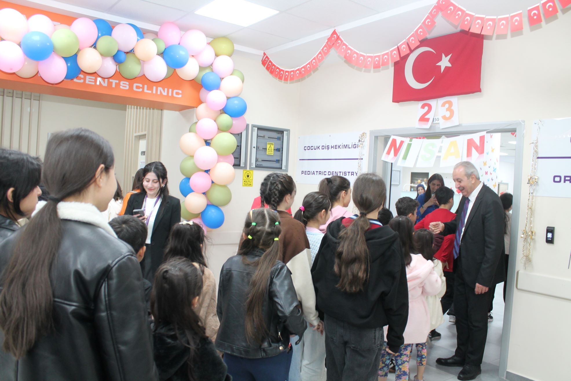 Üniversitemiz Diş Hekimliği Fakültesi Hastanesi’nin “Geleceğe Sağlıklı Gülüşler” sloganıyla yürüttüğü sosyal sorumluluk projesi kapsamında düzenlenen etkinlikte, öğrencilerin ağız ve diş muayeneleri yapıldı. Tekvando Milli Antrenörü Ayşegül KILIÇ POLAT nezaretinde programa katılan öğrenciler, daha sonra 23 Nisan Ulusal Egemenlik ve Çocuk Bayramı haftası dolayısıyla Türk bayrakları, Atatürk posterleri, balon ve kurdelelerle süslenen Çocuk Diş Hekimliği Ünitesi’nde ağırlandı. Öğrenciler, Üniversitemiz Rektörü Prof. Dr. Ahmet Fazıl ÖZSOYLU, Üniversitemiz Diş Hekimliği Fakültesi Dekanı Prof. Dr. Derviş YILMAZ, Üniversitemiz Diş Hekimliği Fakültesi Hastanesi Başhekimi Doç. Dr. Özcan KARATAŞ ve öğretim üyeleri tarafından karşılandı. Rektör ÖZSOYLU burada tüm çocukların 23 Nisan Ulusal Egemenlik ve Çocuk Bayramı’nı kutlayarak onlarla yakından ilgilendi ve bir süre sohbet etti. Çocukları bayramını kutlayan Üniversitemiz Diş Hekimliği Fakültesi Dekanı Prof. Dr. Derviş YILMAZ ise kapsamlı bir ağız ve diş sağlığı bilinci oluşturmayı amaçladıklarını belirterek ağız ve diş sağlığının temellerinin çocukluk döneminde atıldığına dikkat çekti.