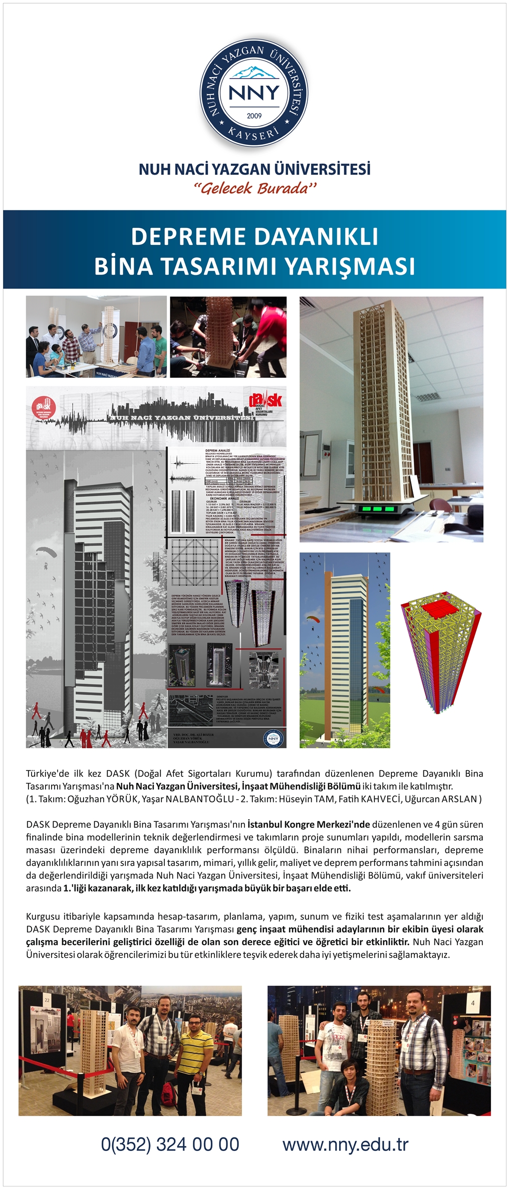 Türkiye’de ilk kez DASK (Doğal Afet Sigortaları Kurumu) tarafından düzenlenen Depreme Dayanıklı Bina Tasarımı Yarışması’na Üniversitemiz İnşaat Mühendisliği Bölümü iki takım ile katılmıştır.