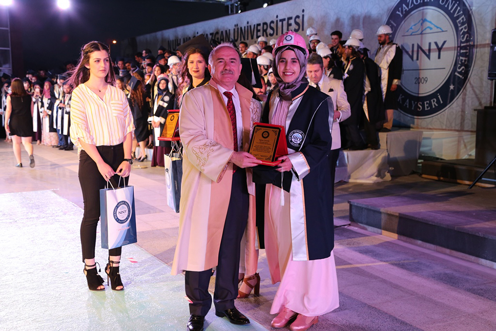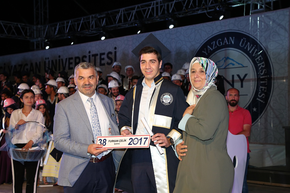 Konuşmalardan sonra dereceye giren öğrencilere plaket ve hediyeleri takdim edildi. Fakülte birincileri mezuniyet kütüğüne isimlerinin yazılı olduğu plaketleri çaktı. Daha sonra öğrencilere mezuniyet belgeleri varildi. Büyükşehir Belediye Başkanı Mustafa Çelik’in İşletme bölümünde okuyan oğlu Furkan Çelik mezuniyet plakasını ve belgesini babası ile annesi İkbal Çelik’ten aldı.